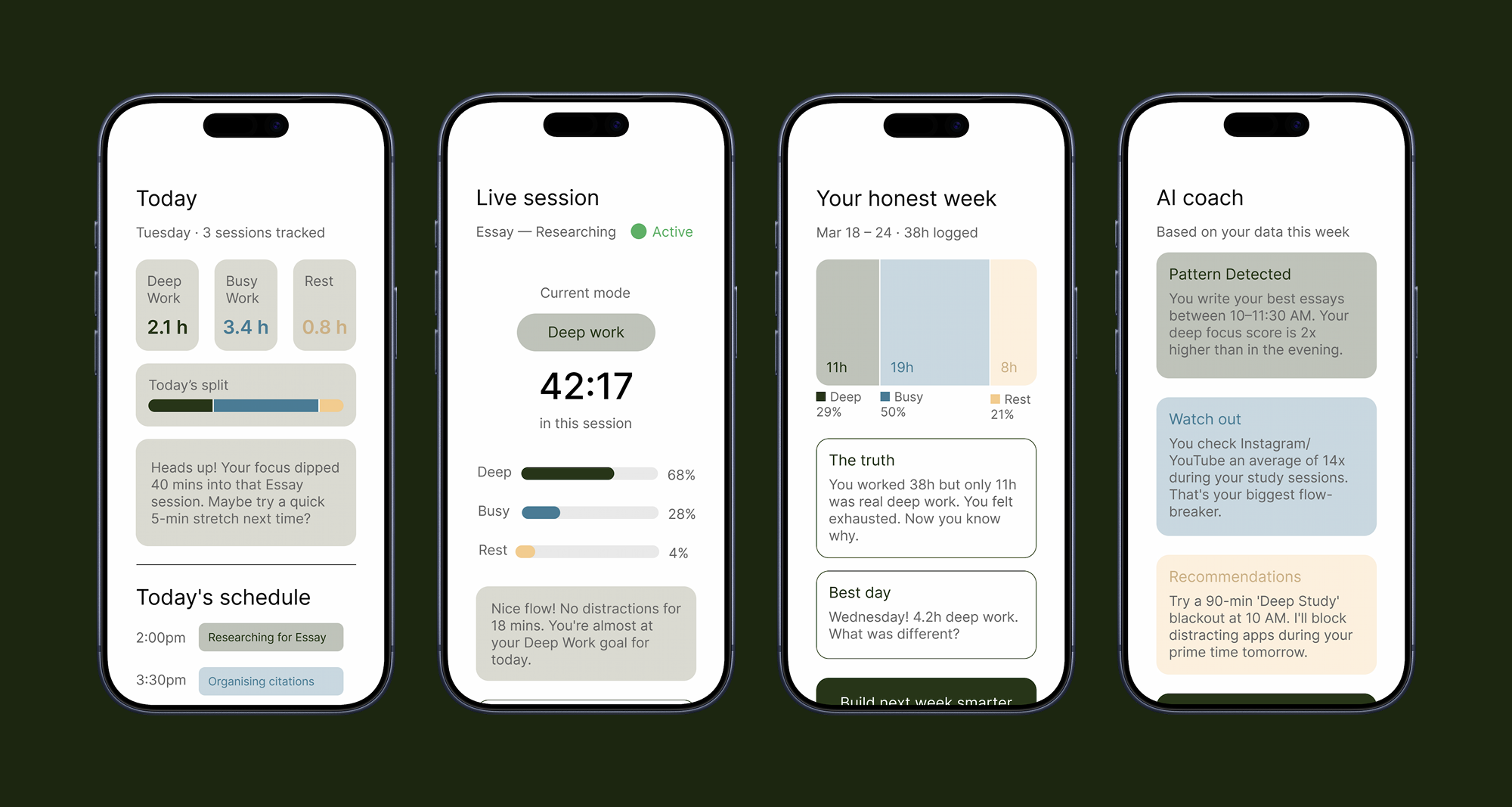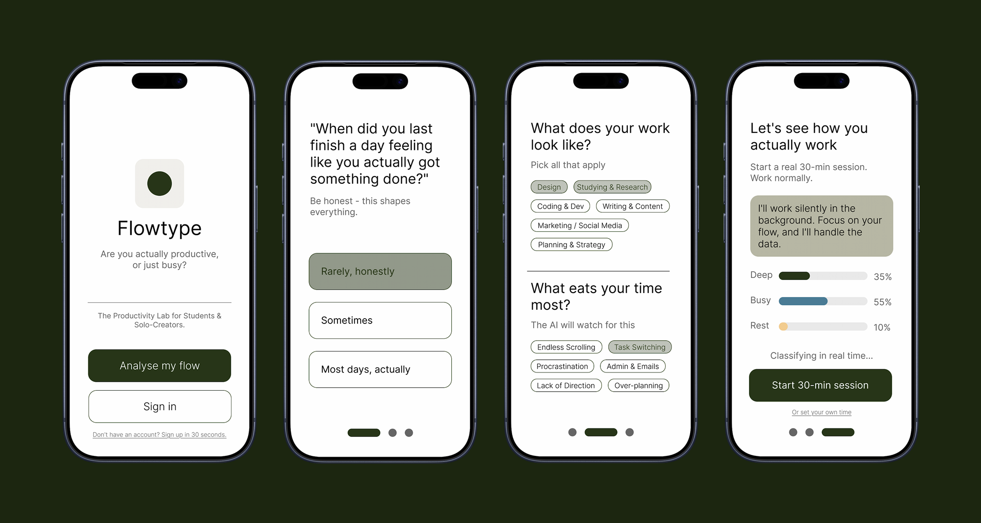 Flowtype is a mobile productivity partner designed for students and solo creators whose work demands deep focus and cognitive endurance. It bridges the gap between how we think we work and how we actually work. By synthesising self-reported goals with real-time behavioural patterns, Flowtype’s AI generates personalised weekly summaries and optimises work schedules by identifying the exact "when" and "how" for peak efficiency.